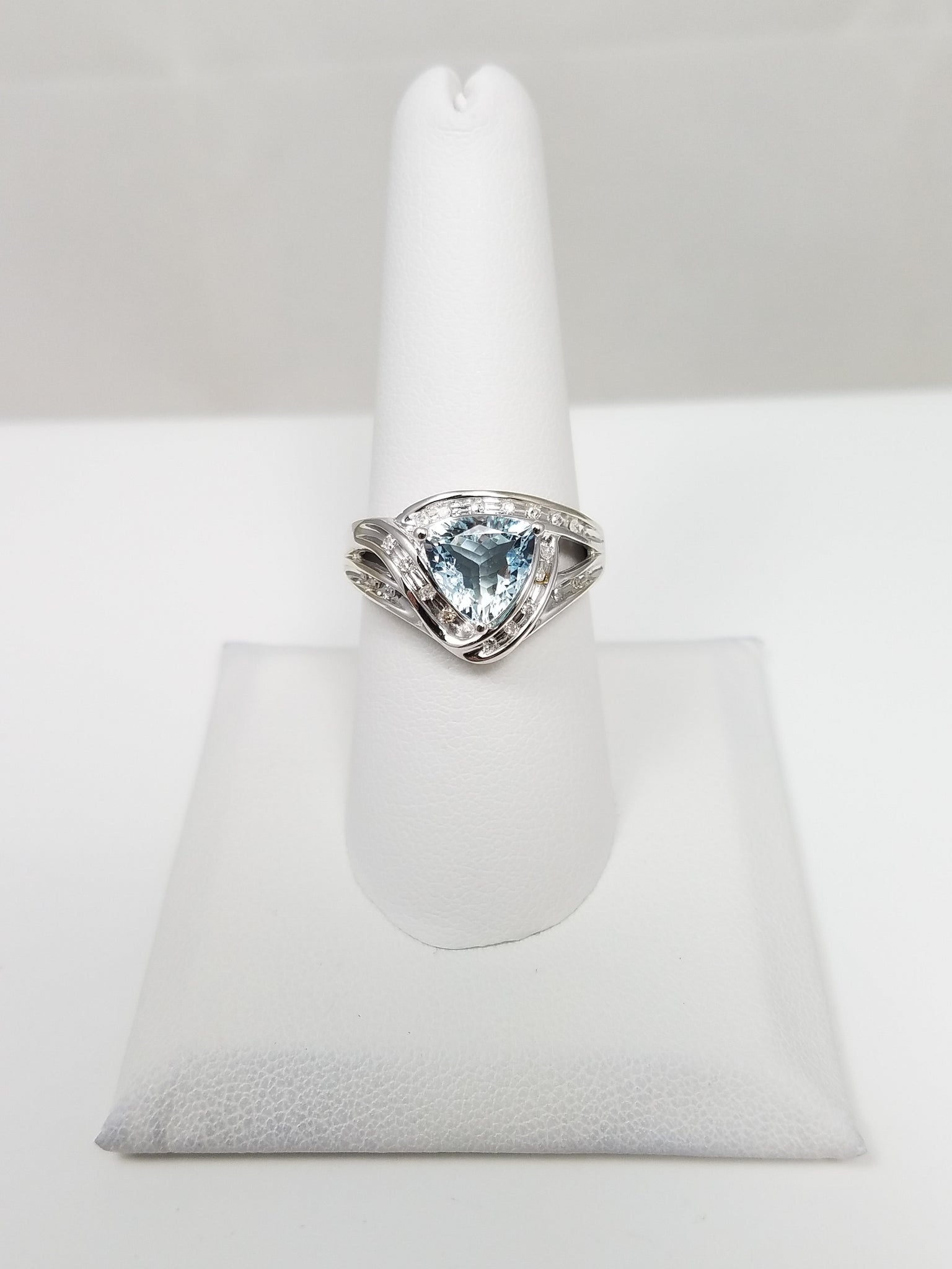 A fabulous trillion cut natural aquamarine takes center stage, accented with ~.05ctw of natural diamonds (1 is missing), designed in 10k (stamped) white gold. Diamonds are SI/I1 in clarity and H/I in color. Ring is size 8. Weighs 3.8 grams.