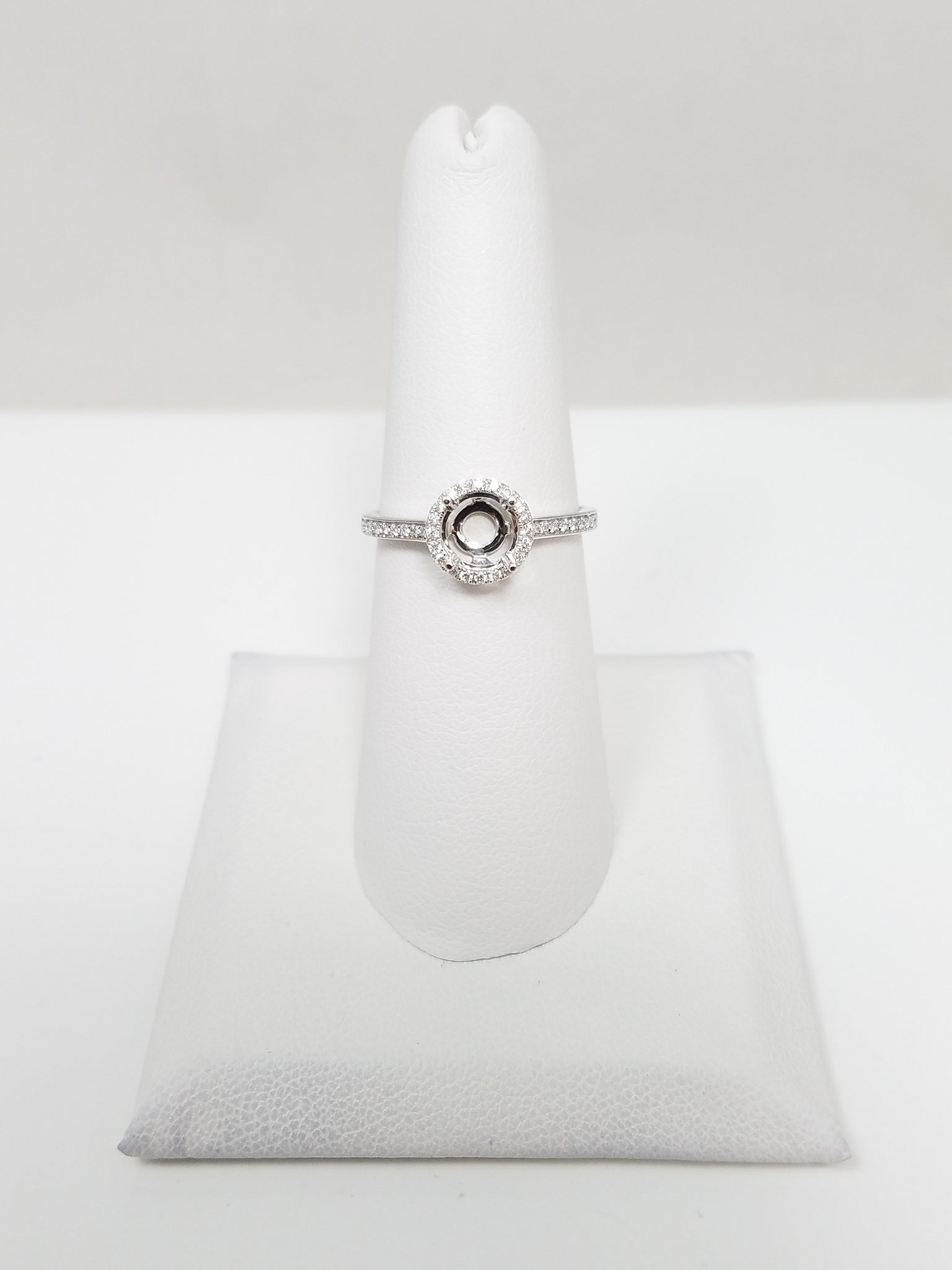 This shimmering new natural diamond engagement ring mount was crafted from 14k white gold (stamped "14k","585"). It features natural round diamonds weighing .16ctw (stamped). The diamonds are VS-SI in clarity and G-H in color. It will hold an approximate 5.5mm round gemstone. Ring size is 6.5. It weighs 2.2 grams.