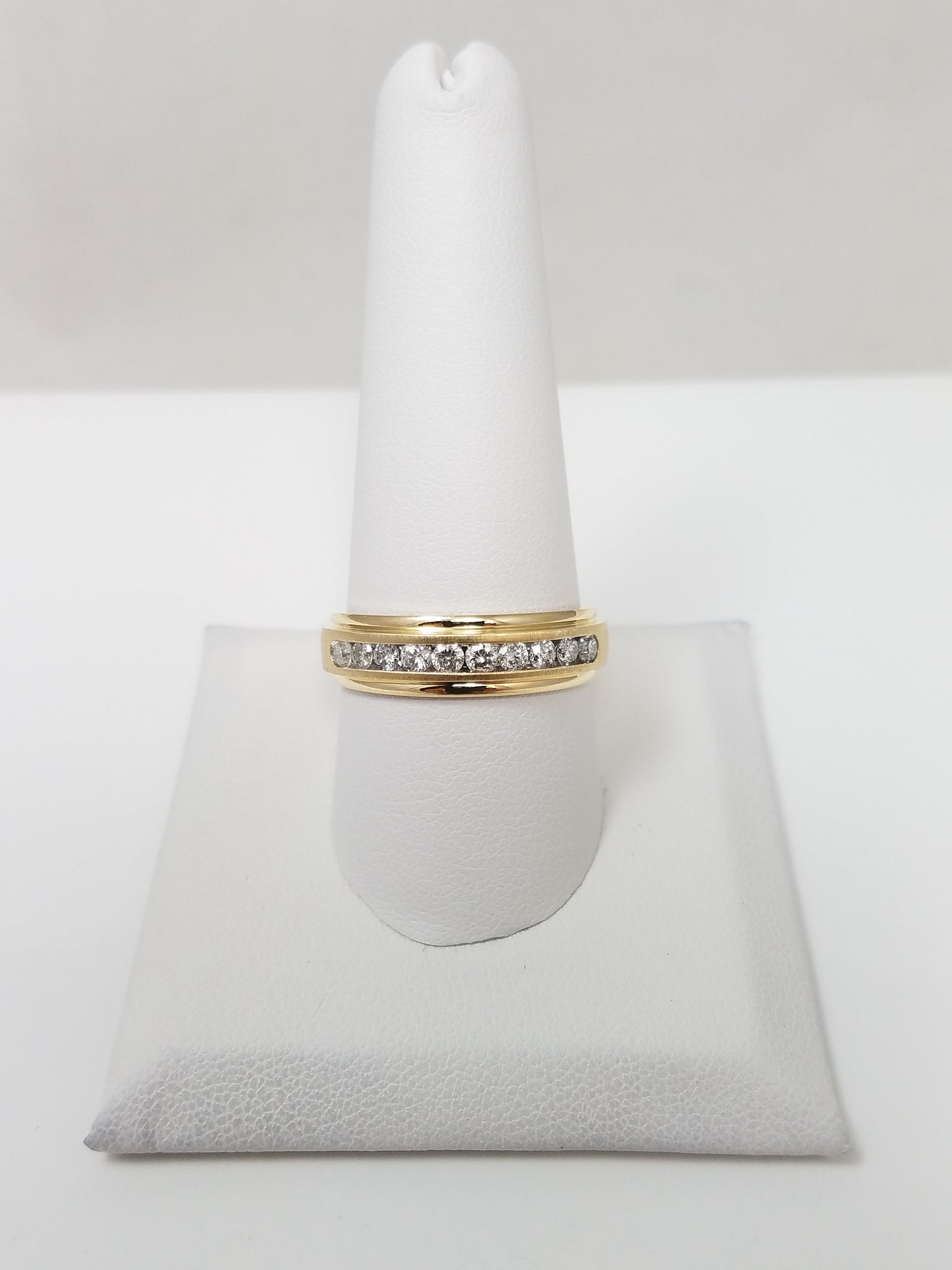This showy new men's natural diamond wedding ring band was crafted from 10k yellow gold (stamped "10k"). It features natural round diamonds weighing approximately .30ctw. The diamonds are I1-I2 in clarity and J-K in color. It measures 6.2mm lengthwise on top of finger. Ring size is 10. It weighs 5.2 grams.