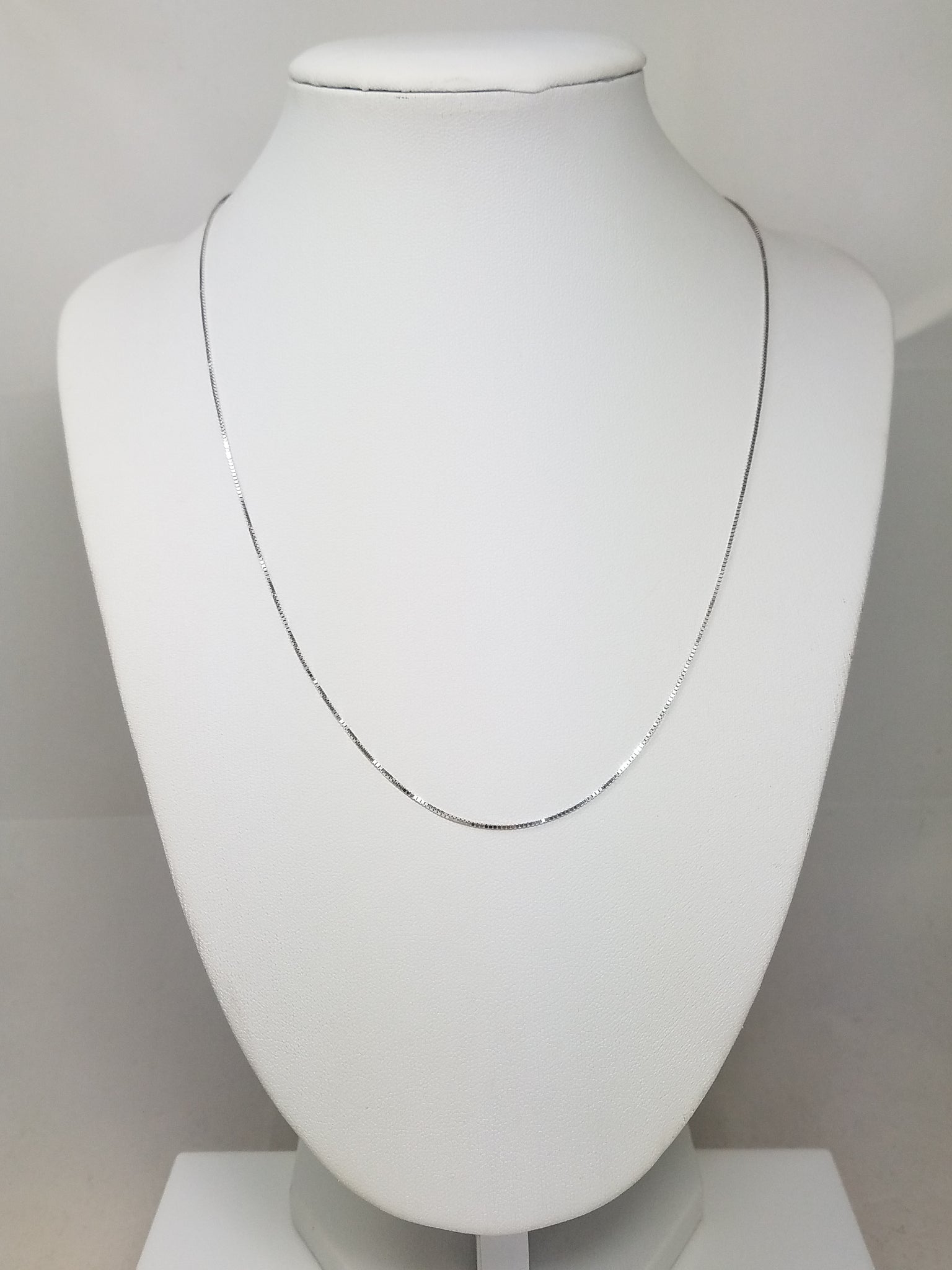 This classic box chain necklace was crafted from 14k white gold (stamped "14k"). Add a pendant or cross to it. It measures 0.8mm wide and 18" in length and is secured with a lobster clasp for wear. It weighs 2.0 grams.