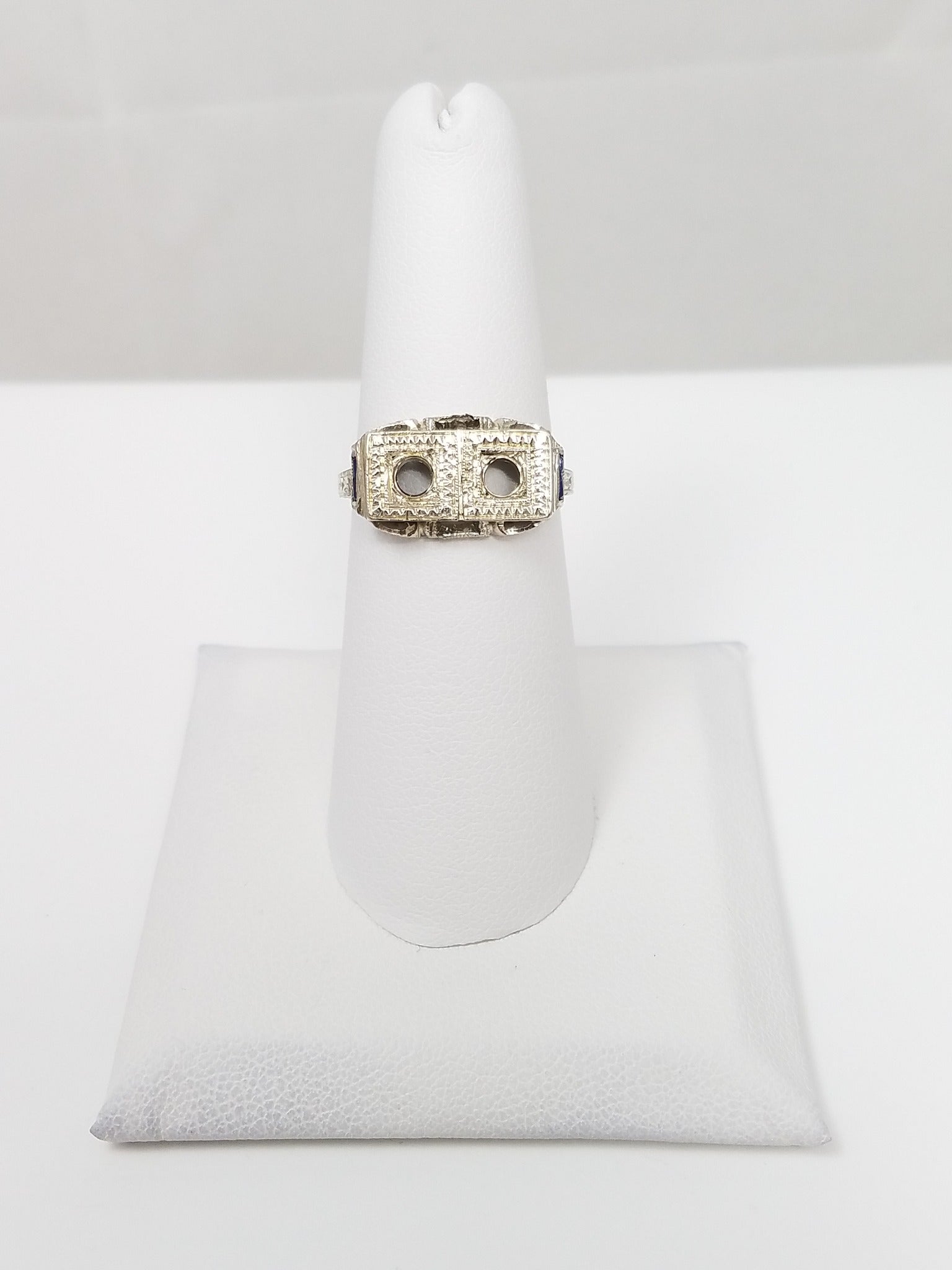 This enchanting art deco engagement ring mount was crafted from 18k white gold (stamped "18k"). It is accented with 2 synthetic blue sapphires that are damaged. The mount will hold two approximate 3.7mm round gemstones. The top of the ring measures 9mm lengthwise on top of finger. Ring size is 6.25. It weighs 4.2 grams.
