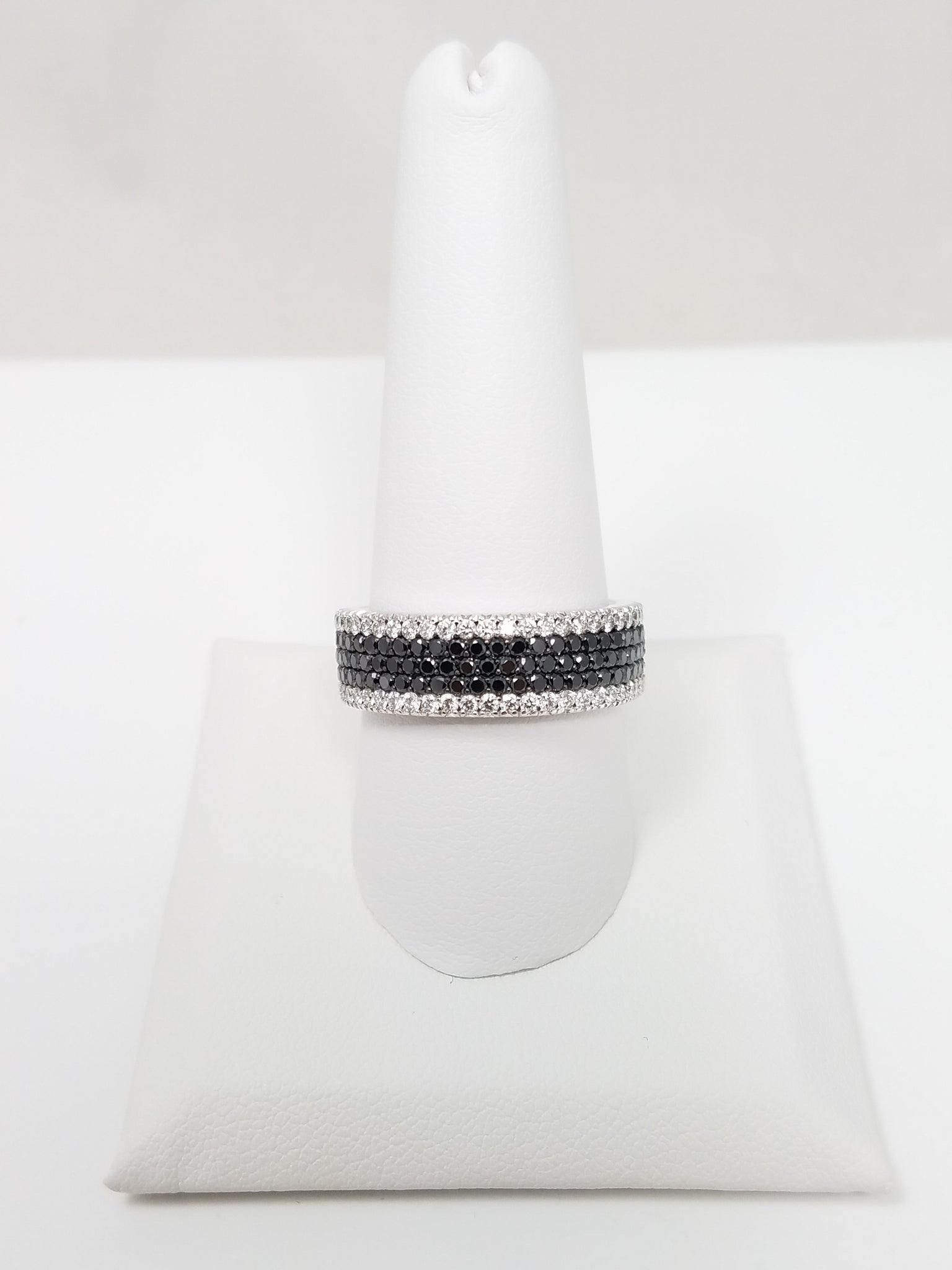 A stunning natural diamond ring band crafted of 14k white gold (stamped "14k"). Features a combination of natural round black and white diamonds weighing approximately 2ctw. The diamonds are SI in clarity and G-H and black in color. Measures 7.5mm lengthwise on top of finger. Ring size is 9.75. Weighs 11.1 grams.