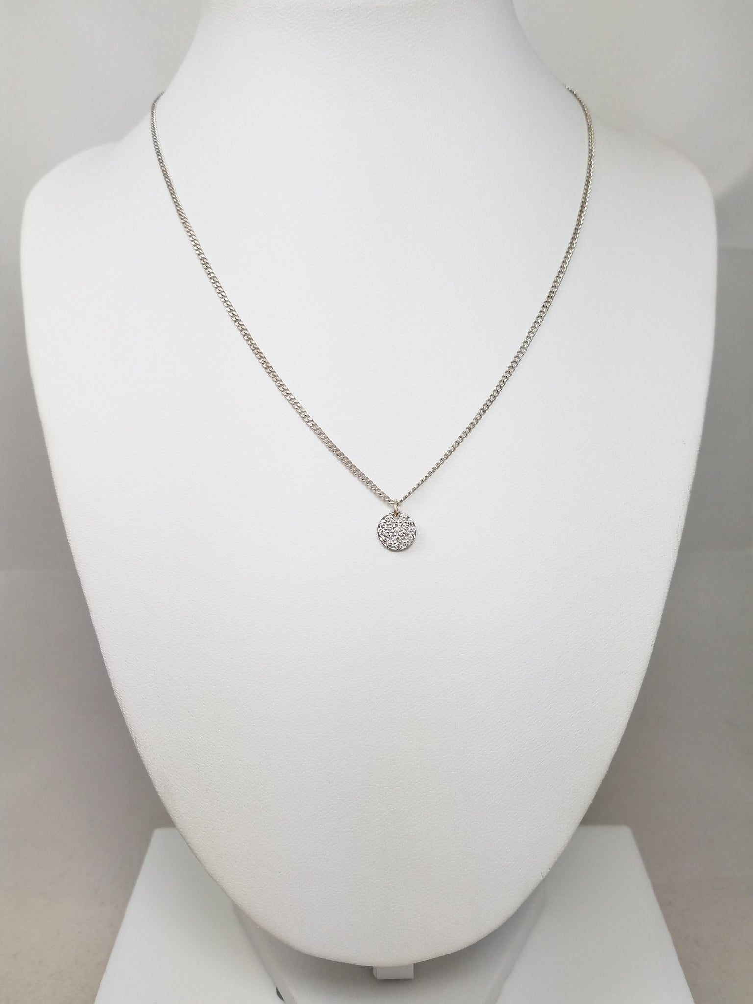 This dainty natural diamond circle pendant necklace was crafted from 14k white gold (stamped "14k"). It features natural round diamonds weighing approximately .10ctw. The diamonds are SI1-I1 in clarity and H-I in color. The pendant measures 8.4mm in diameter and is secured with a bail for wear. The chain measures 1.7mm wide and 15" in length and is secured with a spring ring clasp for wear. It weighs 3.5 grams.