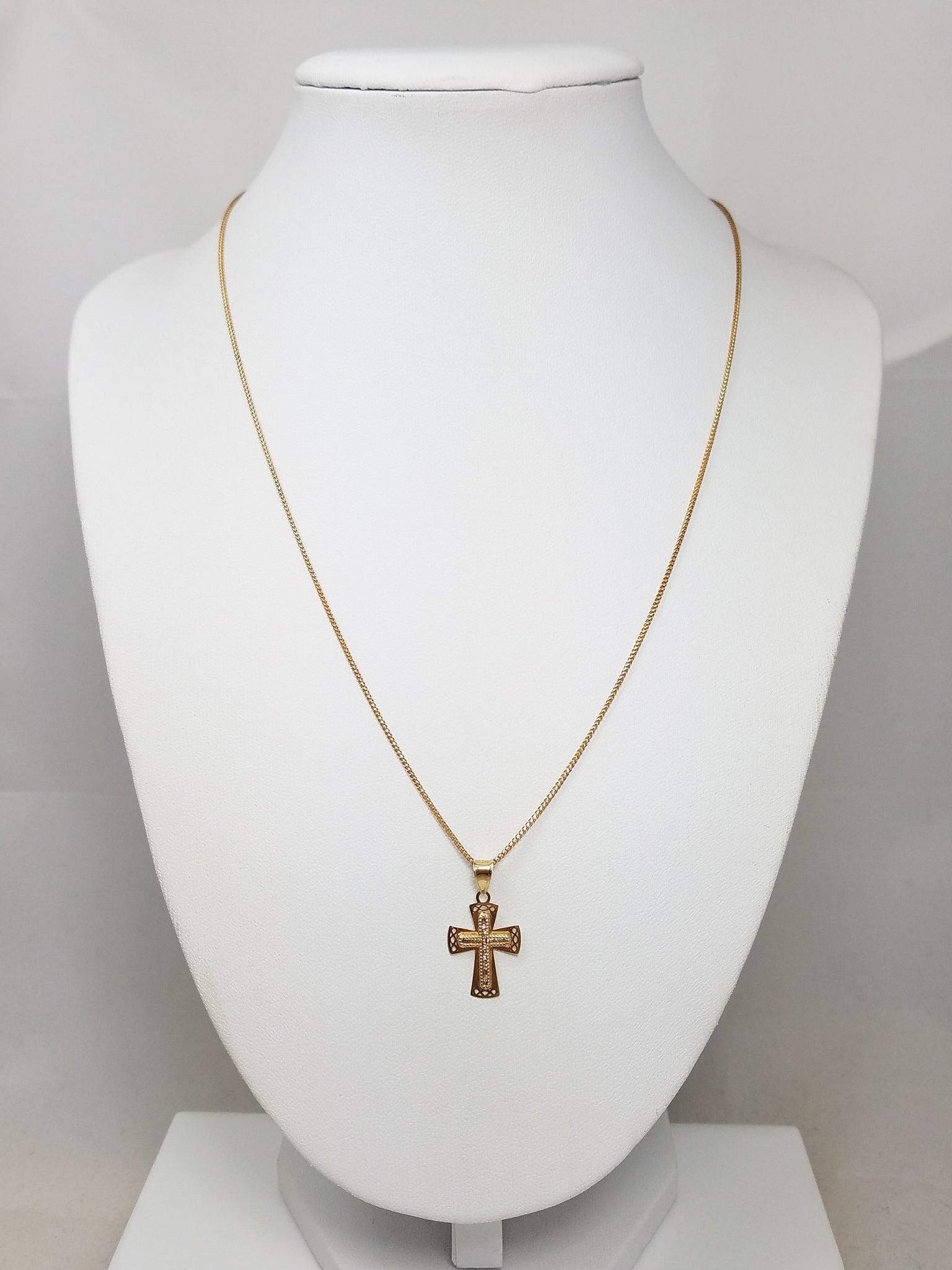 This dainty cubic zirconia cross pendant necklace was crafted from 10k yellow gold (stamped "10k"). This lovely cross features round cut cubic zirconias. It is secured with a bail for wear. The cross measures 1" x .50". The franco link chain measures 1.1mm wide and 18" in length and is secured with a lobster clasp for wear. It weighs 2.8 grams total.