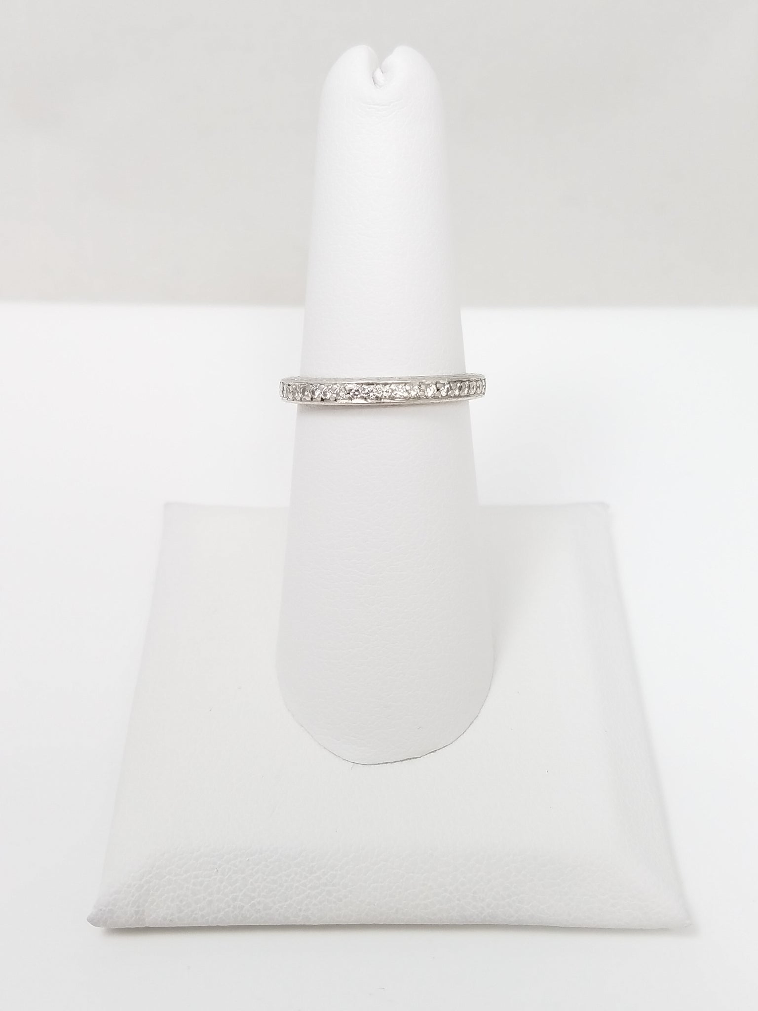 A gorgeous platinum (stamped "PT950") wedding ring band. Ring is accented with ~.10ctw of natural diamonds (SI/VS clarity, H color) on top half of ring. Ring measures 2.7mm wide and is a size 6.25. Weighs 4.6 grams.