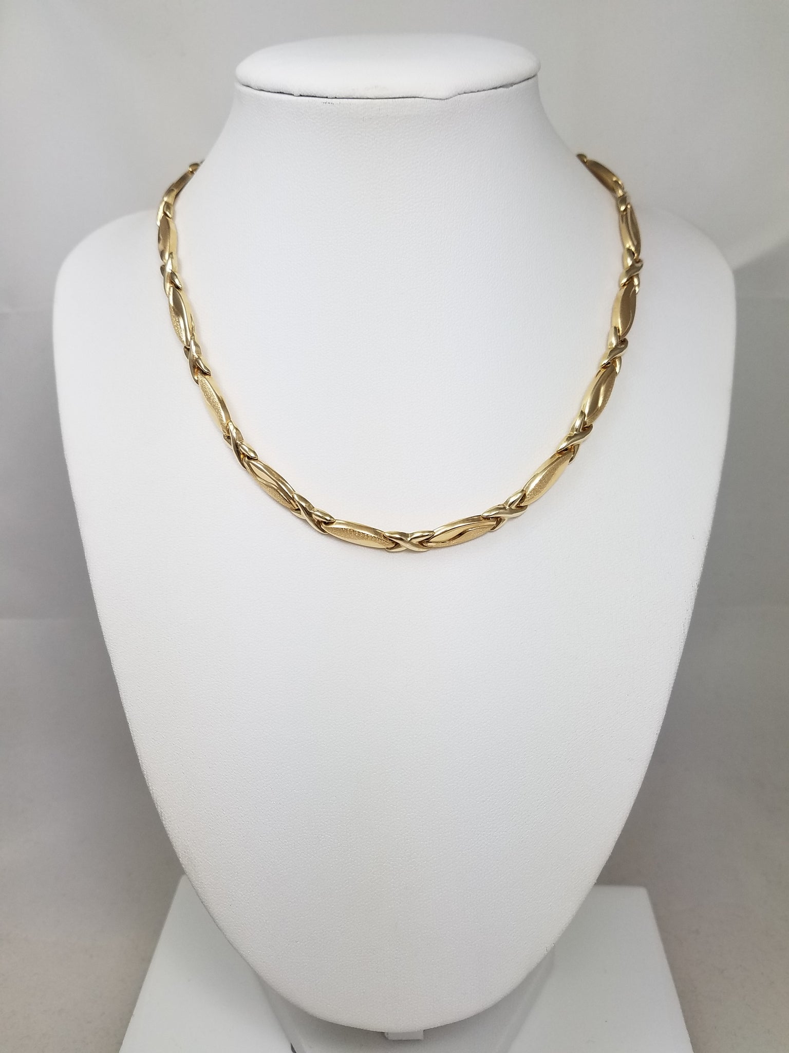 This lovely hugs and kisses necklace was crafted of 14k yellow gold (stamped "14k"). It features a beautiful stain and high polished design. It measures 6mm wide and 15.5" in length and is secured with a slide locking clasp for wear. It weighs 16.2 grams.