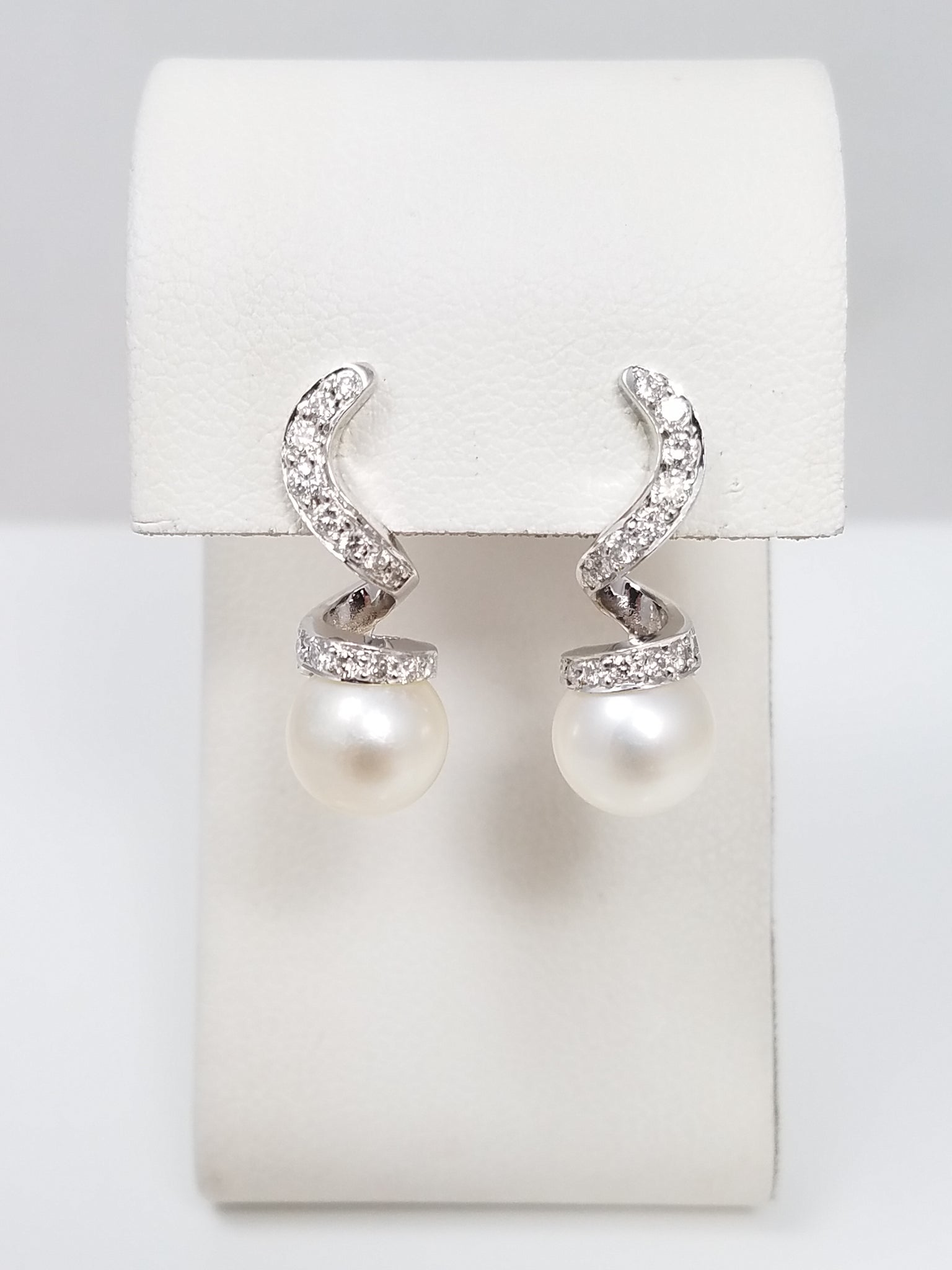 Remarkable 18k White Gold Cultured Akoya Pearl Natural Diamond Dangle Earrings