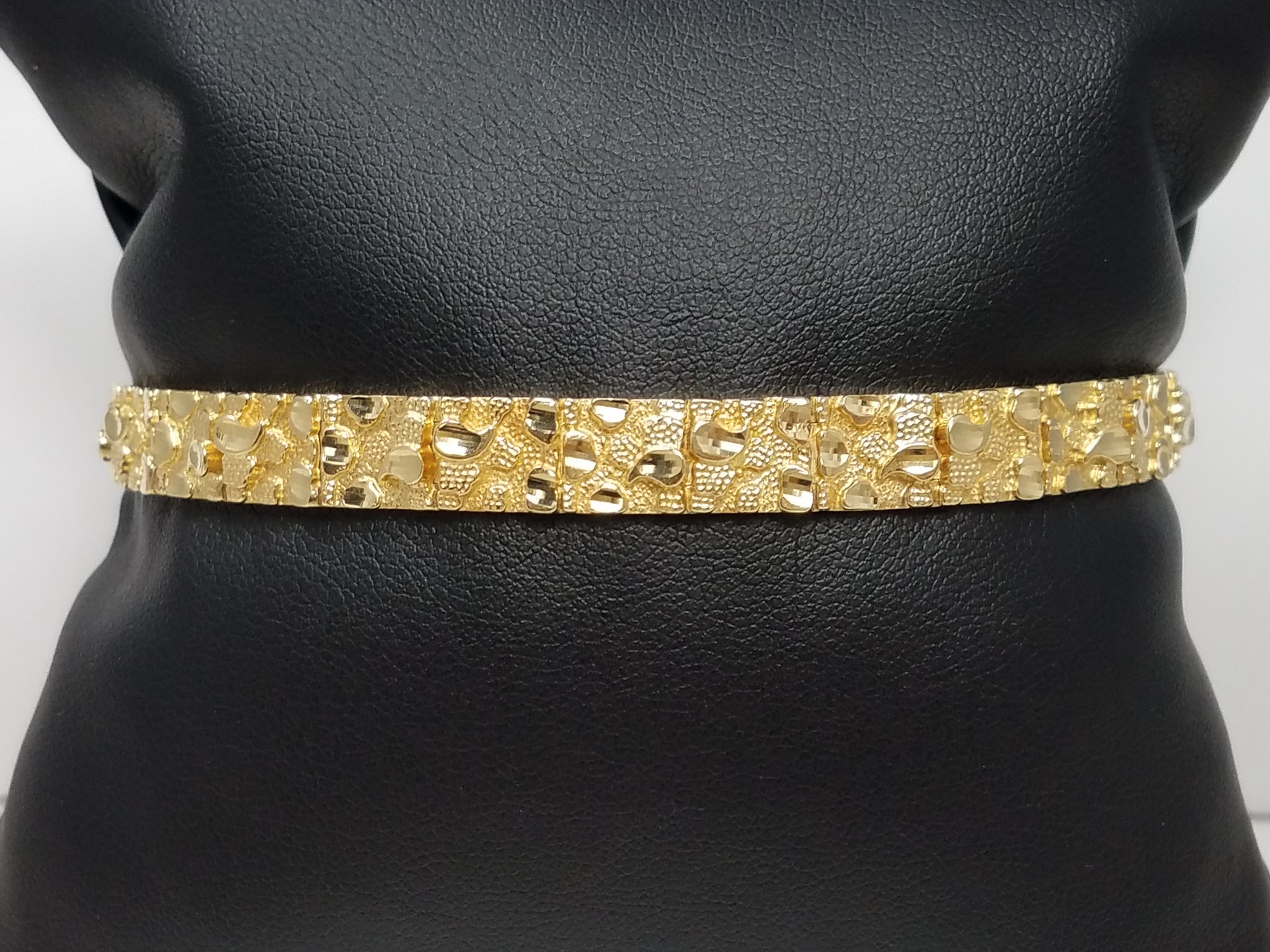 This sporty nugget bracelet was crafted from 10k yellow gold (stamped "10k"). Nugget jewelry is hot right now! It measures 7.5mm wide and 8" in length and is secured with a fold over locking clasp for wear. It weighs 14.4 grams.
