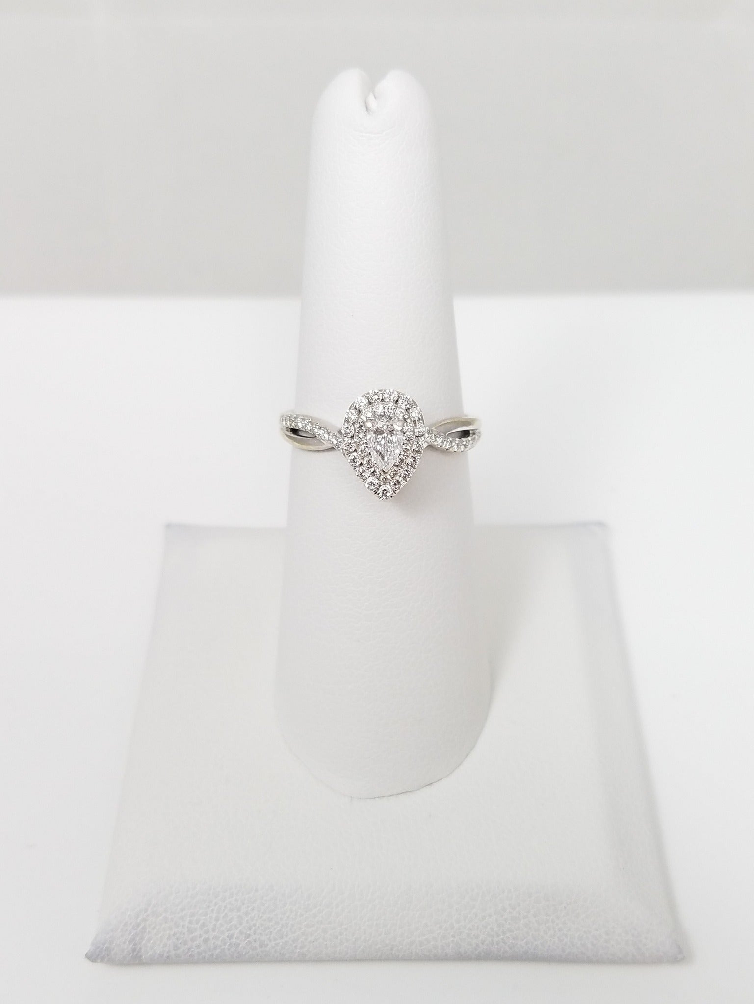This exciting natural diamond engagement ring was crafted from 14k white gold (stamped "14k"). It features a combination of natural pear shaped and natural round shaped diamonds weighing ~.50ctw. The diamonds are VS1-I1 in clarity and G-H in color. The ring measures ~10mm lengthwise on top of finger. Ring size is 6.5. It weighs 3.0 grams.