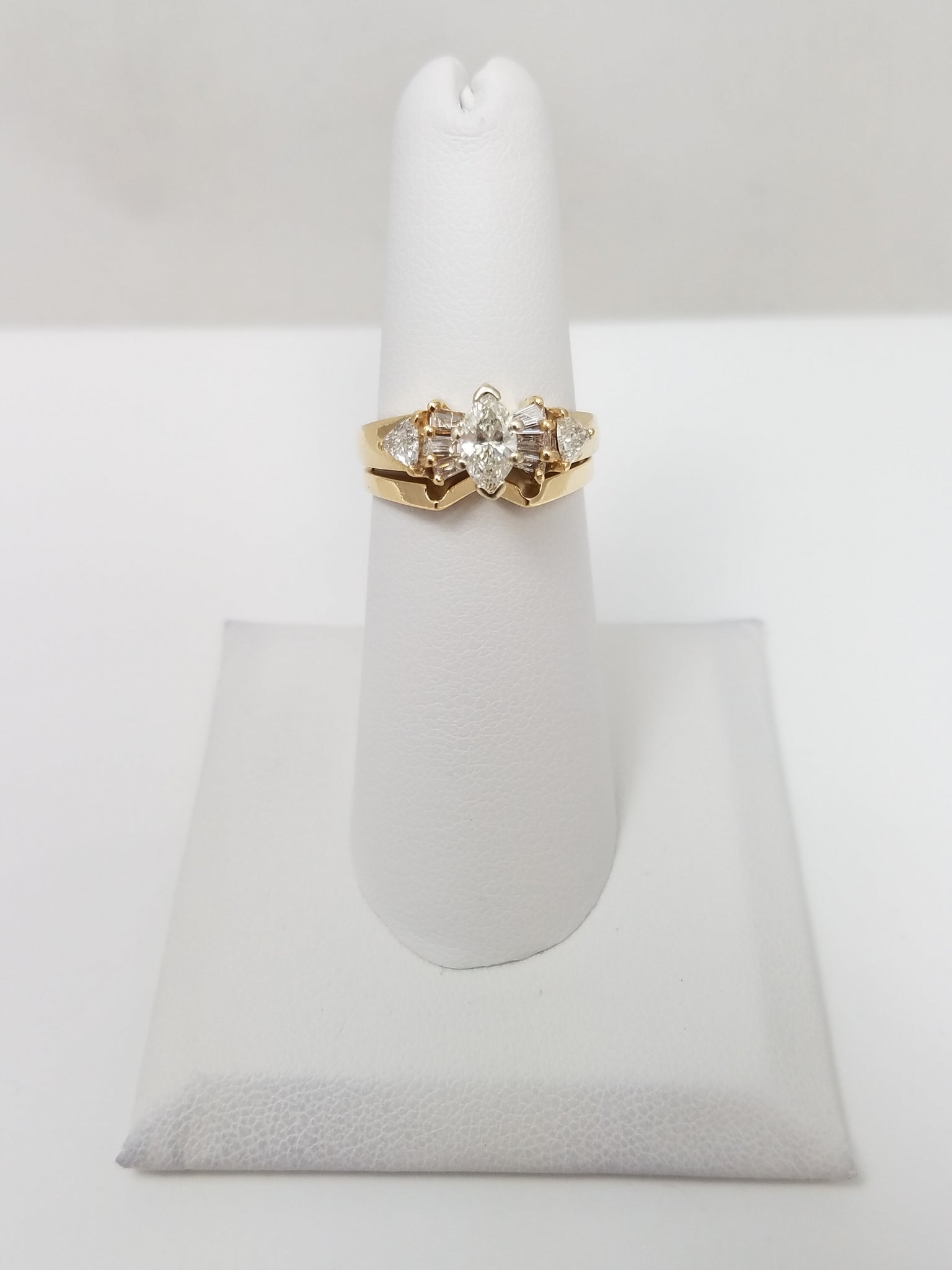 This lovely natural diamond engagement ring set was crafted from 14k yellow gold (stamped "14k"). It features a center natural marquise shaped diamond weighing approximately .38ct. It is SI2 in clarity and I-J in color. It is accented with a combination of natural baguette and natural triangle diamonds weighing approximately .32ctw. The side diamonds are VS-SI in clarity and H-I in color. Ring size is 5.75. It weighs 5.1 grams. The rings are soldered together.