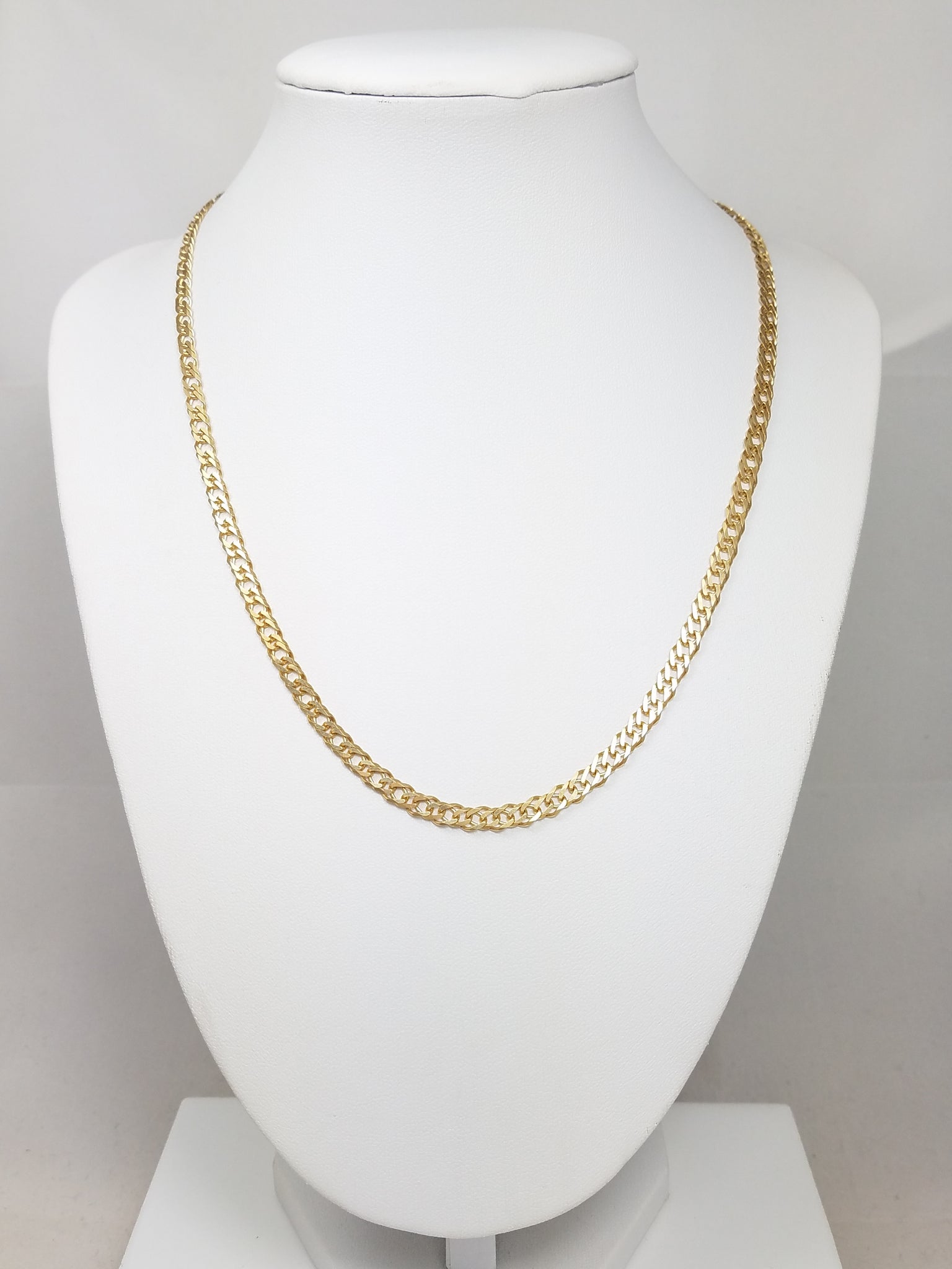 A gorgeous solid beveled fancy link chain necklace crafted of 14k yellow gold (stamped "14k"). Add a pendant or cross to it. Secures with a lobster clasp for wear. Measures 4.1mm wide and 18" in length. Weighs 12.0 grams.