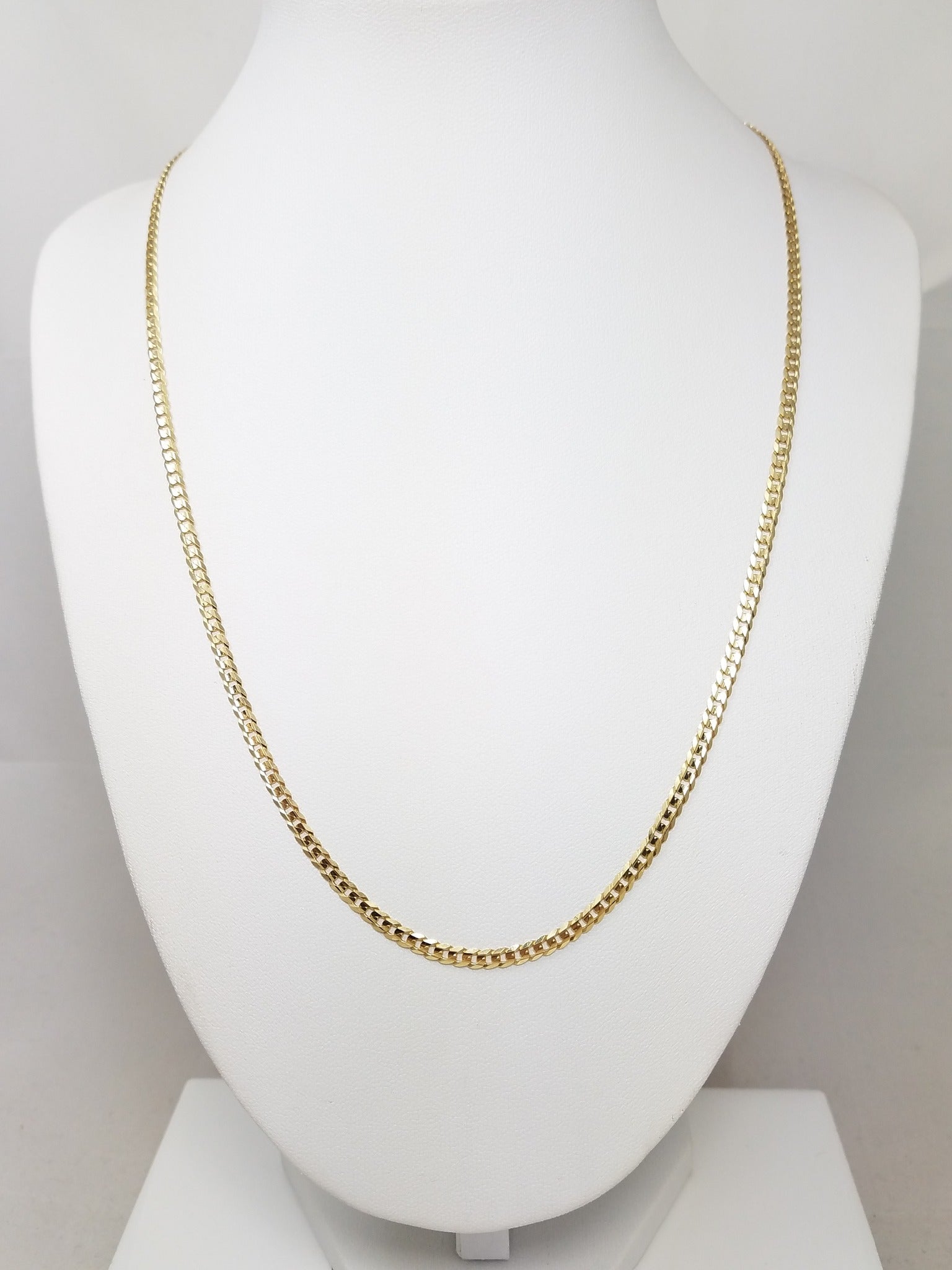 This solid micro concave curb link chain is crafted of 14k yellow gold (stamped). Measures 3mm wide and 20" long. Weighs 7.6 grams. Secures with a lobster clasp for wear.