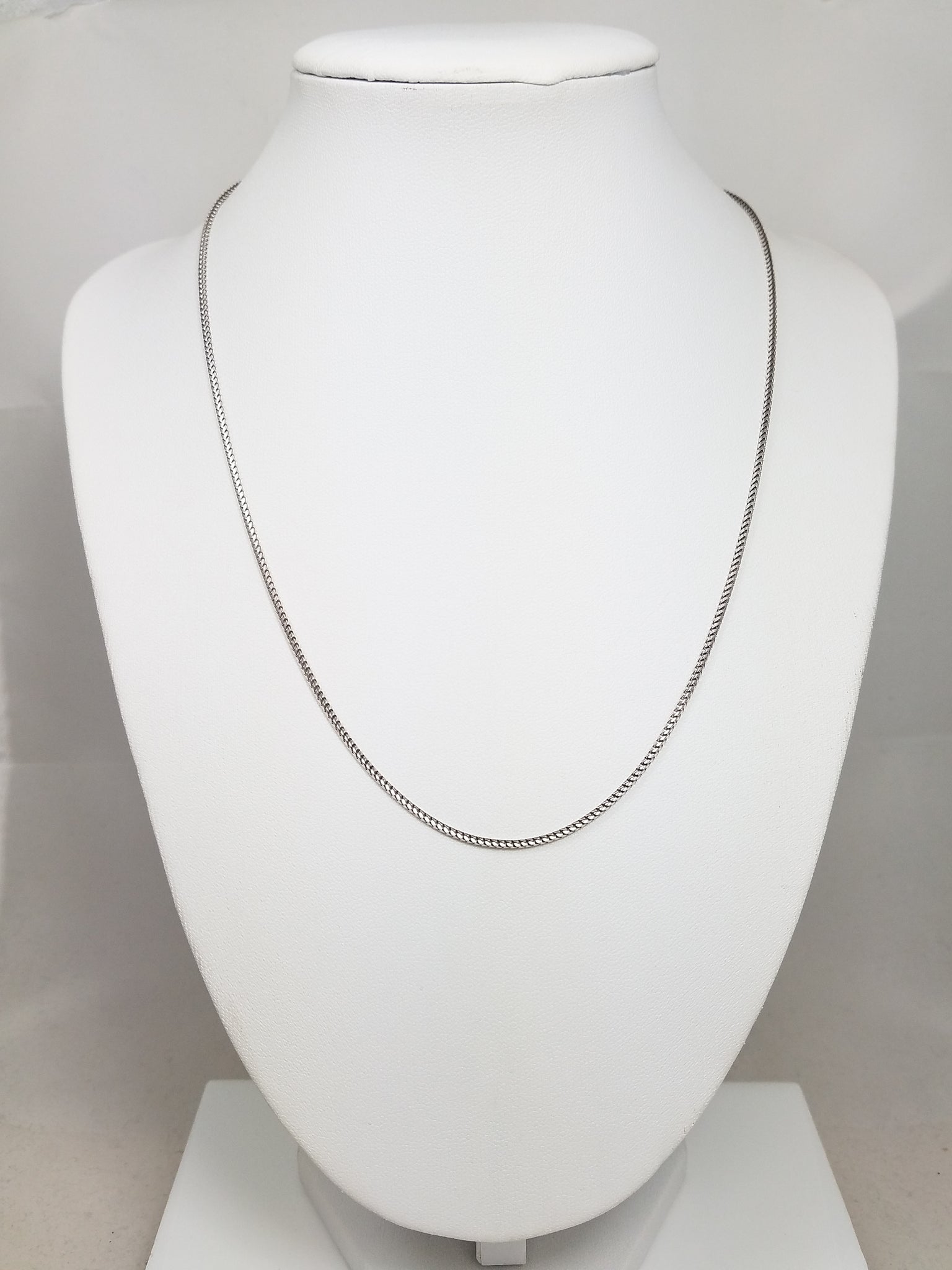 A solid micro Franco link necklace, crafted in 14k (stamped) white gold, measuring 1.2mm wide and 18" long. Secures with lobster clasp for wear. Weighs 6.1 grams.