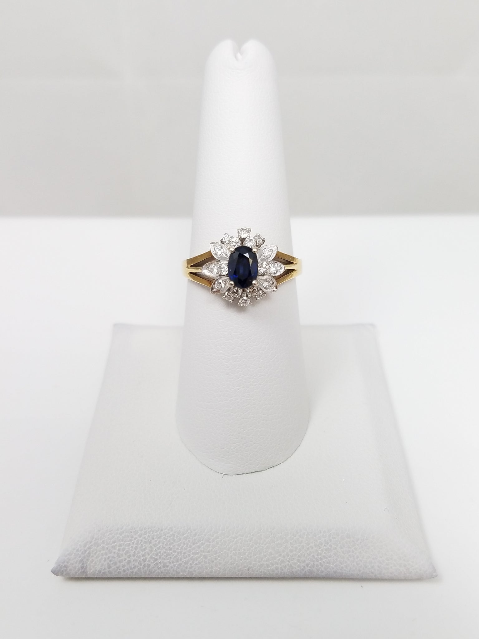 This gleaming natural sapphire and diamond ring was crafted from 14k yellow and white gold (stamped "14k","585"). It features a center natural oval shaped blue sapphire. It is accented with natural round diamonds weighing approximately .20ctw. The diamonds are SI1-I1 in clarity and I in color. The ring measures 11.7mm lengthwise on top of finger. Ring size is 7.5. It weighs 4.0 grams.