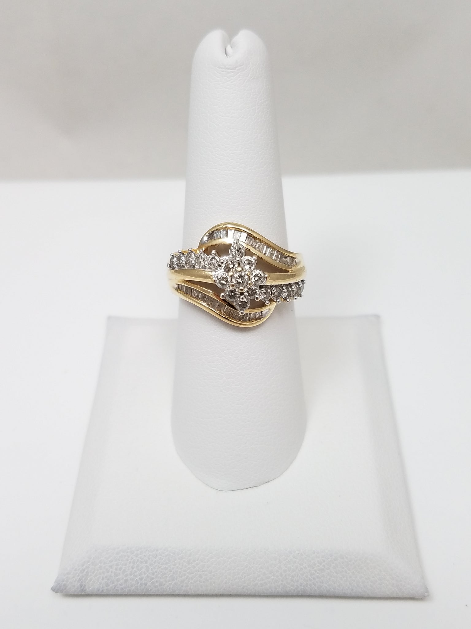 This gorgeous ring is crafted of 10k (marked) yellow gold. The ring holds .33ctw of natural diamonds that are I/J and I1/I2. The ring measures 15mm lengthwise on top and is a size 7.5. The total weight is 3.5 grams.