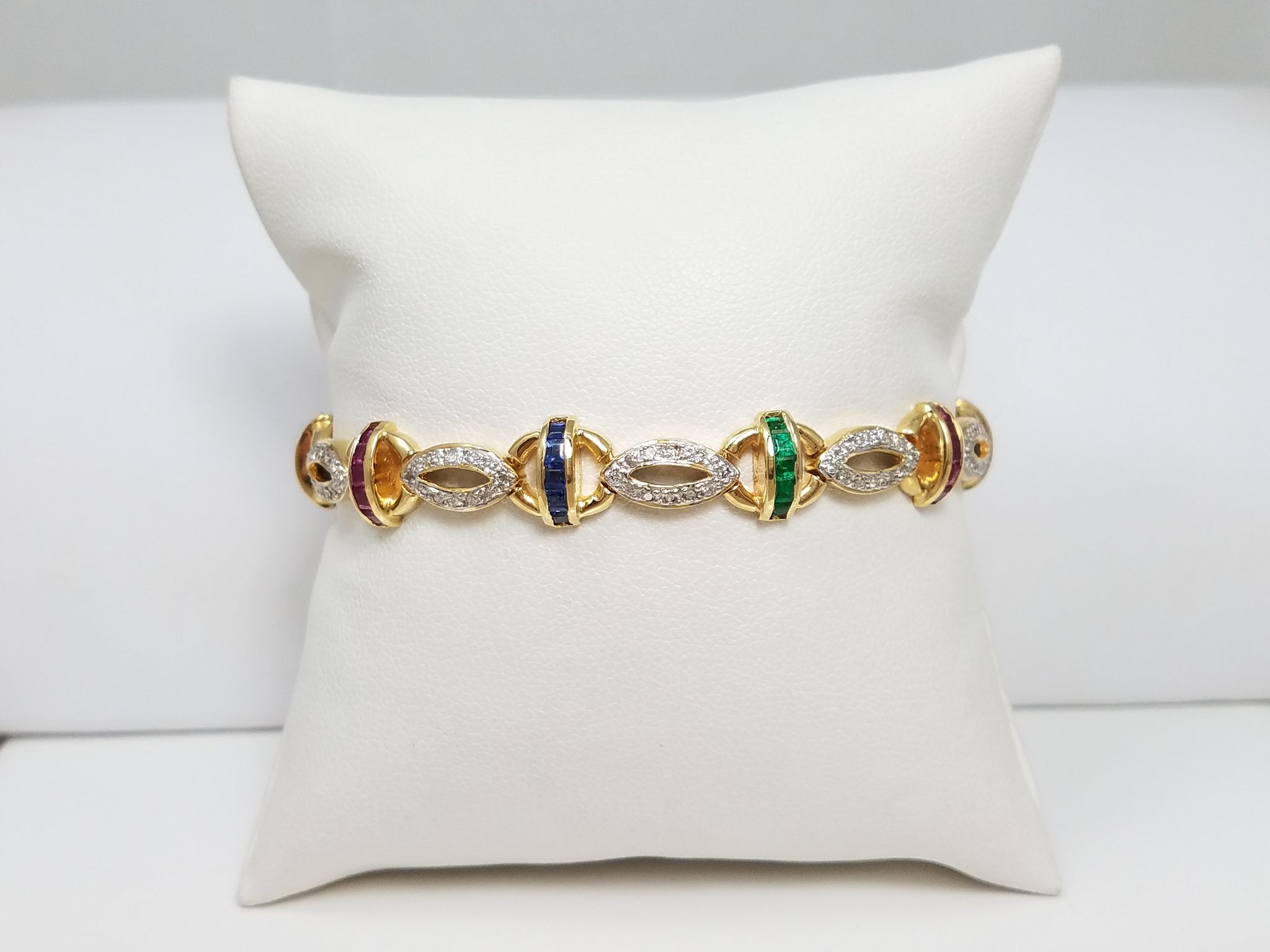Spectacular 18k Yellow Gold Ruby, Emerald, Sapphire Diamond 7" Bracelet
