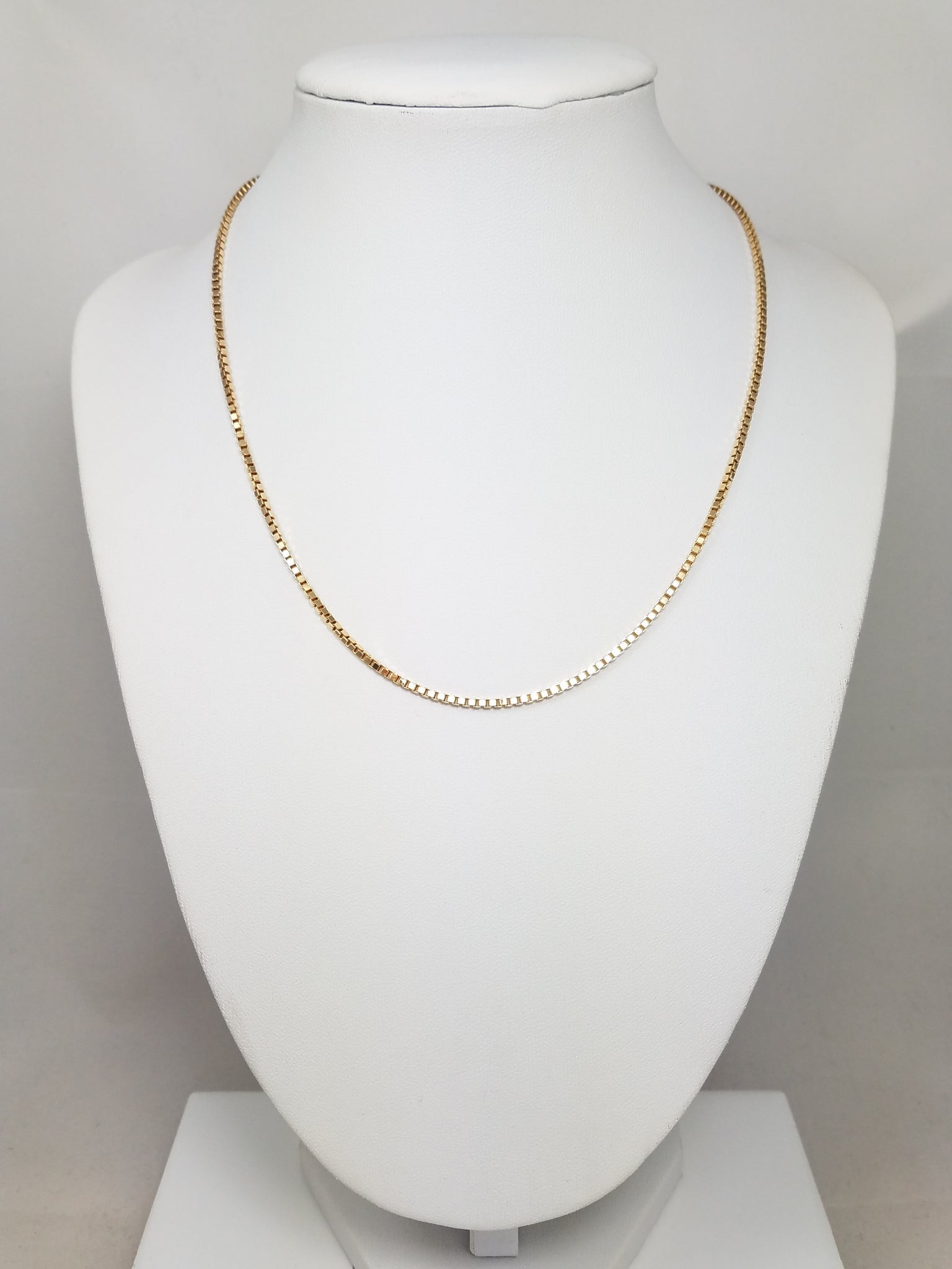This classic solid box link chain necklace was crafted from 14k yellow gold (stamped "14k","585"). Add your favorite pendant to it. It measures 1.7mm wide and 16" in length and is secured with a lobster clasp for wear. It weighs 3.8 grams.