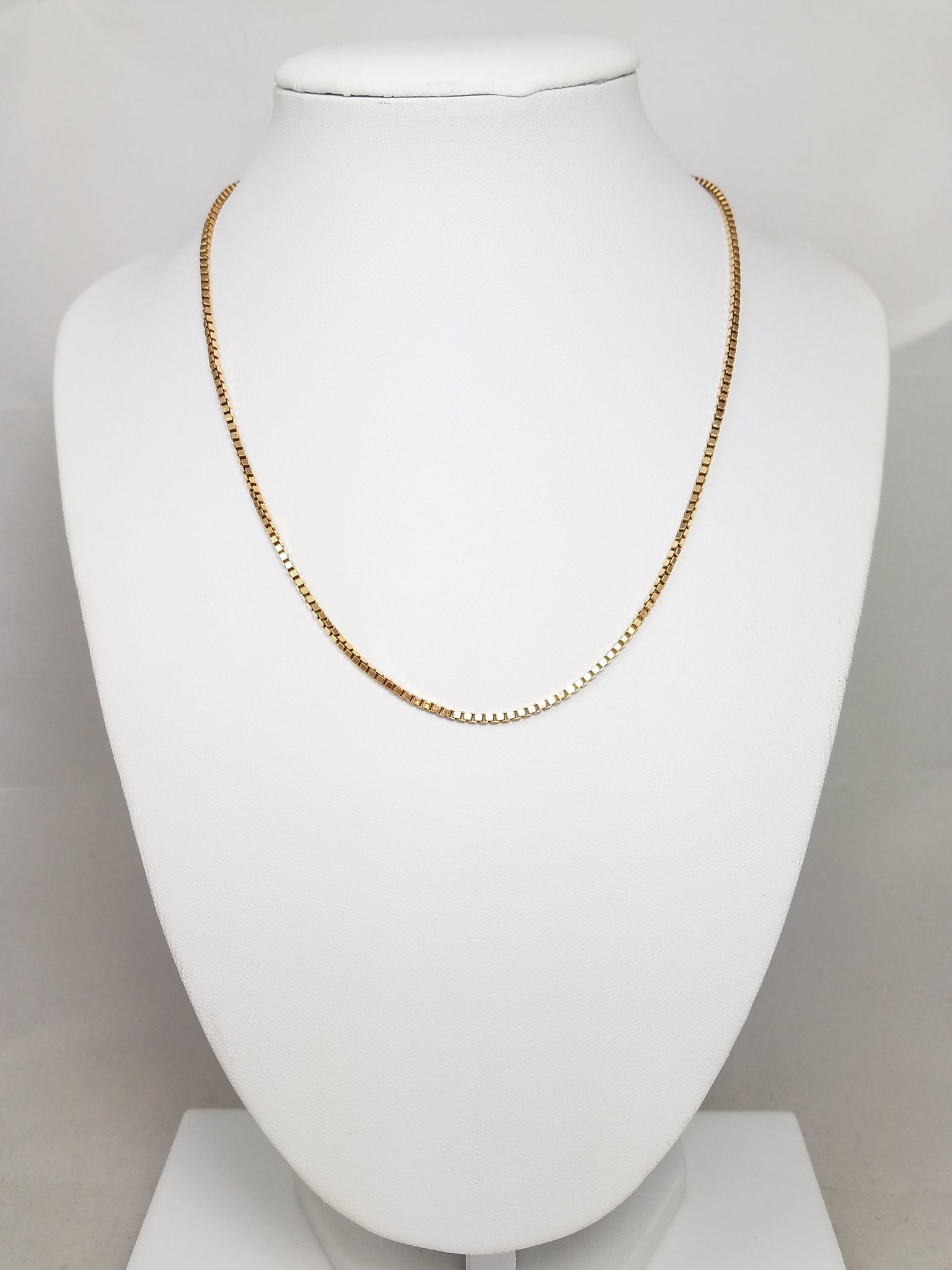 This classic design solid box link chain necklace was crafted from 14k yellow gold (stramped "585"). Add your favorite pendant to it. It measures 1.7mm wide and 16" in length and is secured with a lobster clasp for wear. It weighs 3.9 grams.