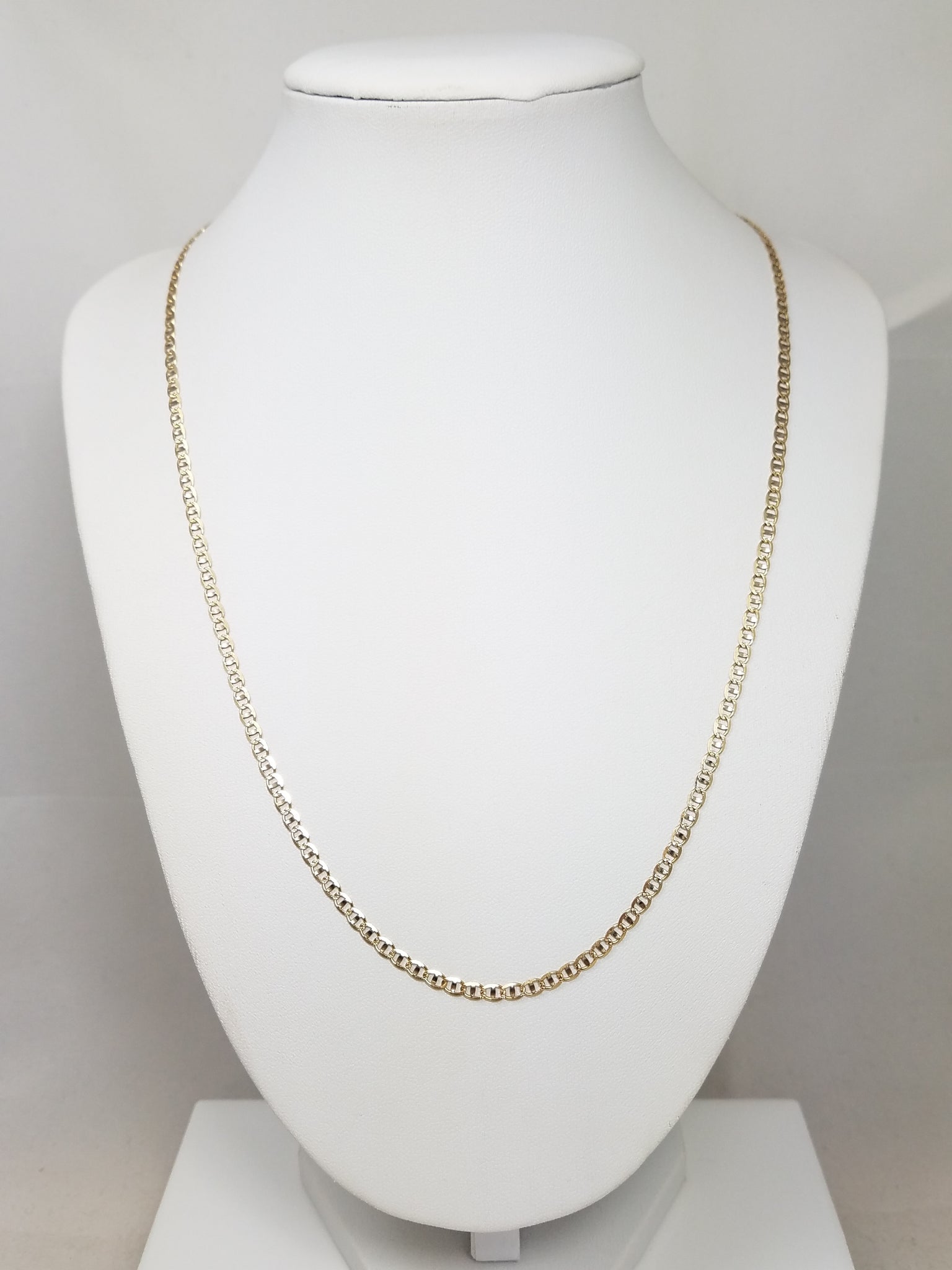 This flashy solid mariner link chain necklace was crafted from 14k yellow gold (stamped "585"). Add a pendant or cross to it. It measures 3mm wide and 20" in length and is secured with a lobster clasp for wear. It weighs 5.3 grams.