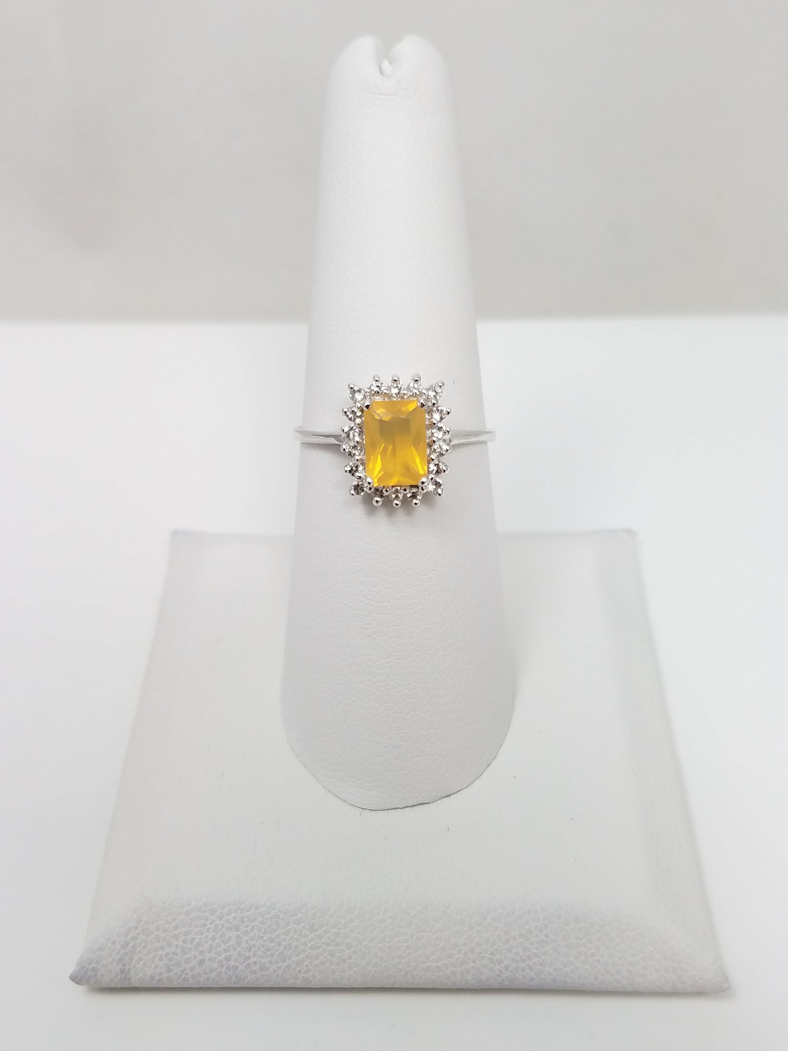 This pretty ring is crafted of 14k (marked) white gold. The ring weighs a total of 2.7 grams and is a size 7. The ring measures 11mm lengthwise at the top. All of the stones are lab grown in this ring.