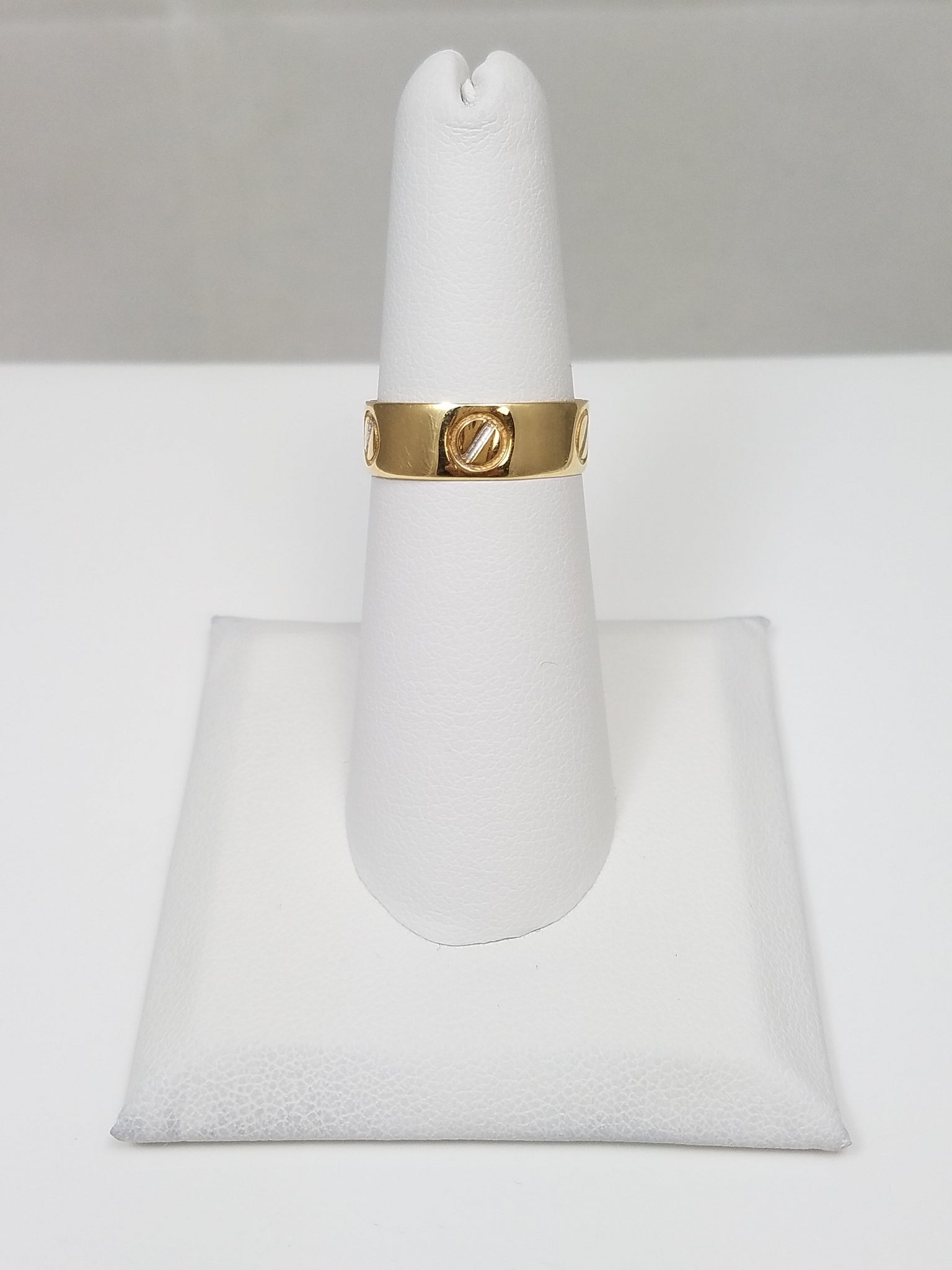 This 18k (stamped 750) yellow gold ring. There are white gold accents inside the slits. Ring size is 5.5. Weighs 2.9 grams. Measures 5.8mm wide.