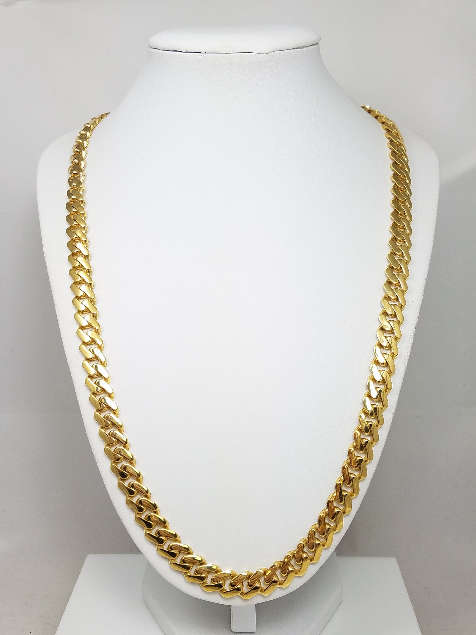 This flashy hollow Miami Cuban link chain necklace was crafted from 14k yellow gold (stamped "14k"). Add your favorite large pendant to it. It measures 9.1mm wide and 24" in length and is secured with a slide locking clasp for wear. It weighs 31.0 grams.