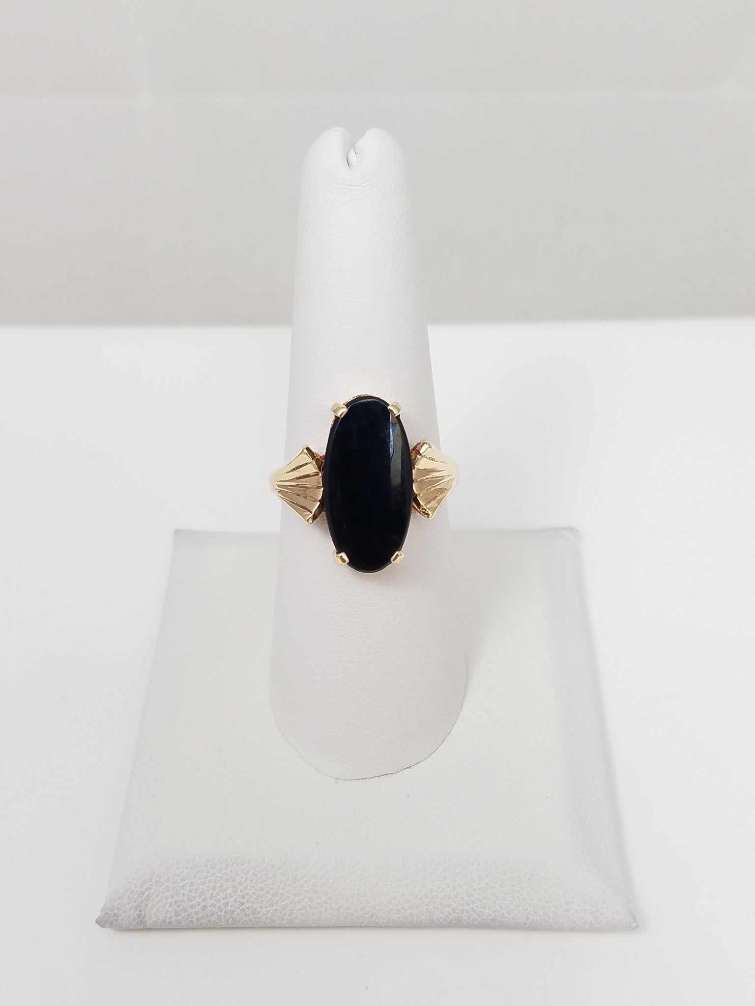 This vintage ring is crafted in 10k (stamped) yellow gold and showcases a large elongated oval black onyx gemstone (~18x9mm). Ring is size 7.5. Weighs 4.7 grams.