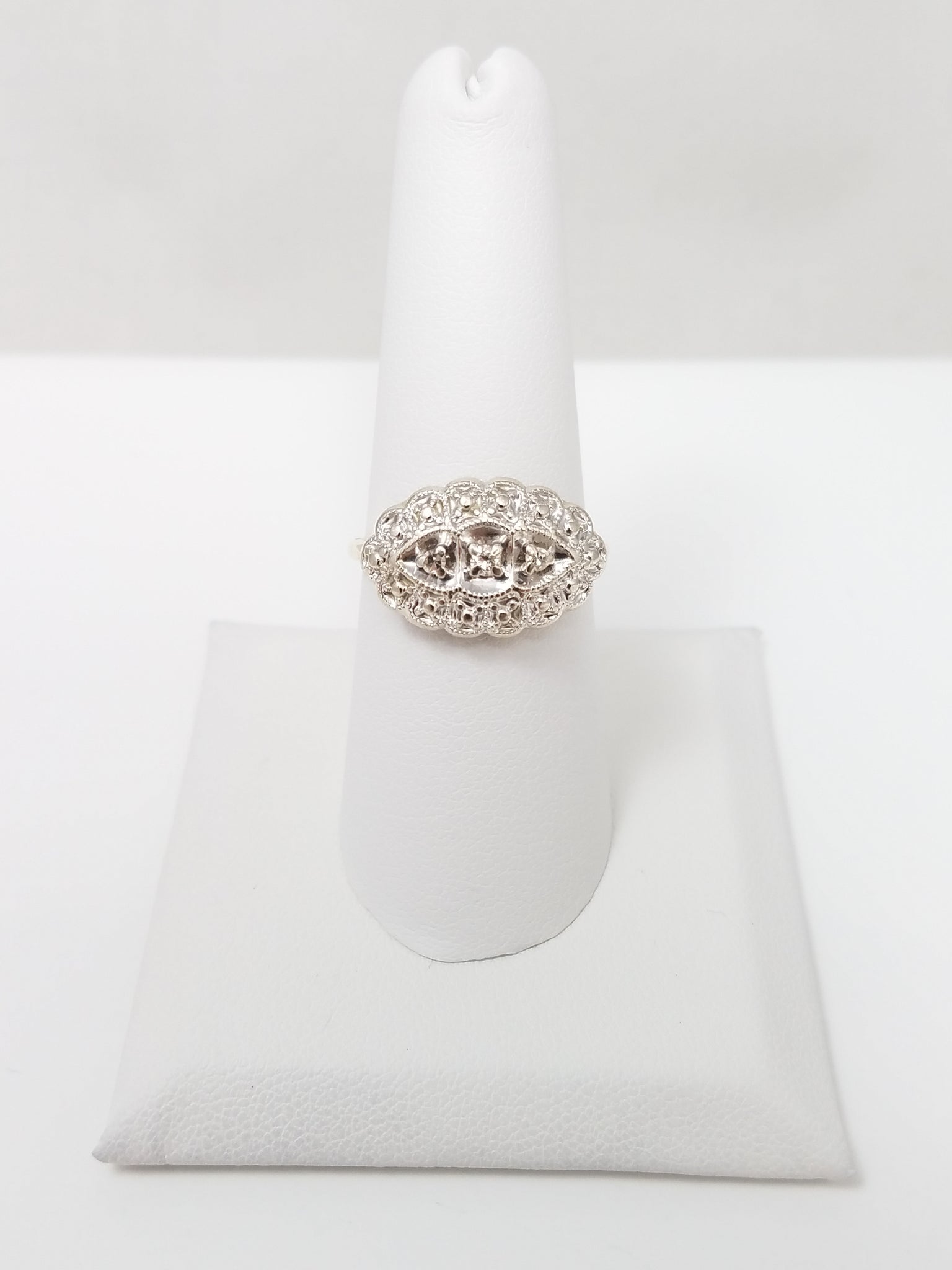 This vintage diamond princess ring was crafted from 14k yellow and white gold (stamped "14k"). Features three natural round diamonds (SI & I-J) that weigh ~0.03ctw. Ring size is 7.75. It weighs 3.8 grams.