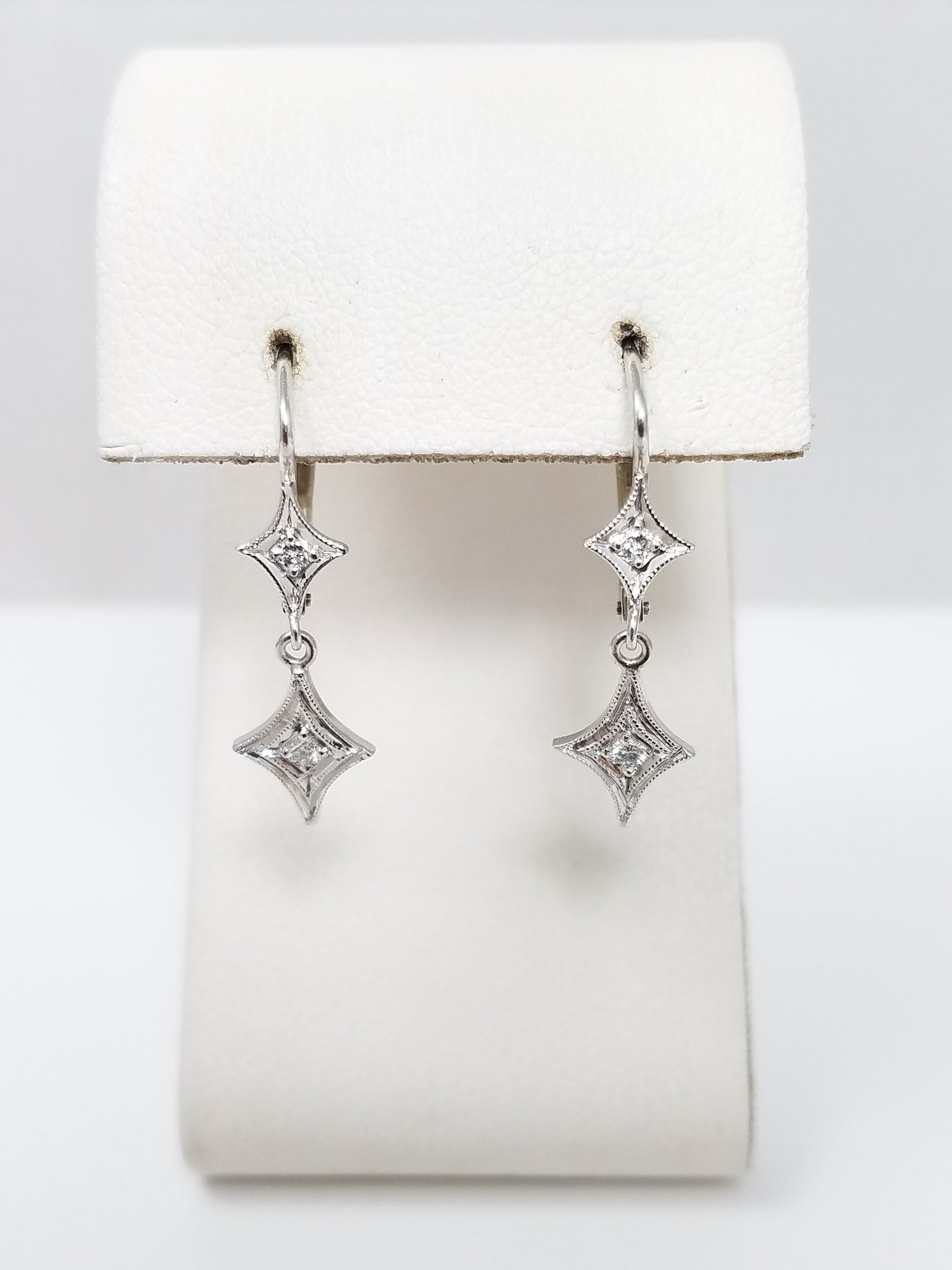 These elegant vintage dangle lever back earrings are crafted in 14k (stamped) white gold, and sparkle with natural diamond accents. Diamonds total ~.04ctw and are SI clarity and H color. Earrings dangle ~1" long. Weigh 2.7 grams.