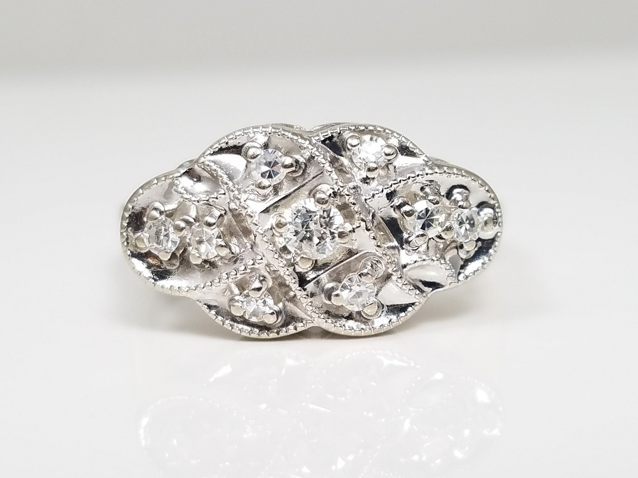 This timeless vintage princess ring is crafted in 14k (stamped) white gold, and adorned with ~.15ctw of natural diamond accents. Diamonds are SI-I1 in clarity and H/I in color. Ring measures 10mm wide on top and is a size 8.75. Weighs 3.8 grams.