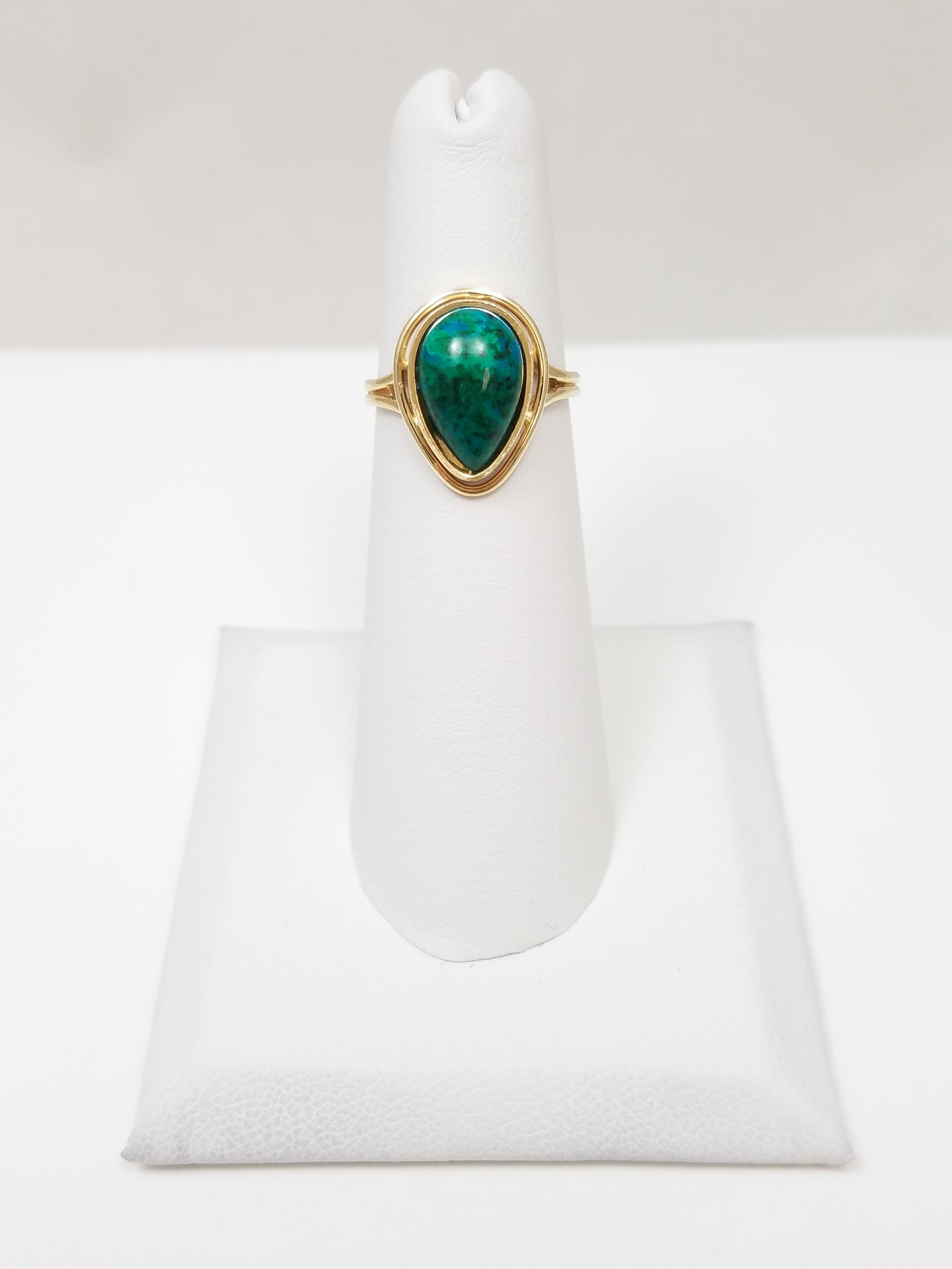 A beautiful vintage ring, crafted in 14k (stamped) yellow gold, decorated with a pear shaped natural green gemstone. Ring measures 15mm wide on top and is a size 4.25. Weighs 2.8 grams.